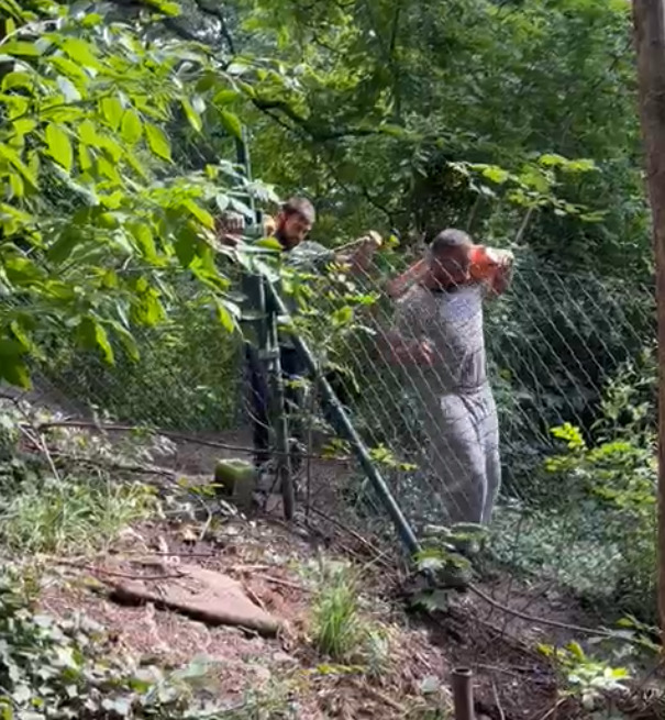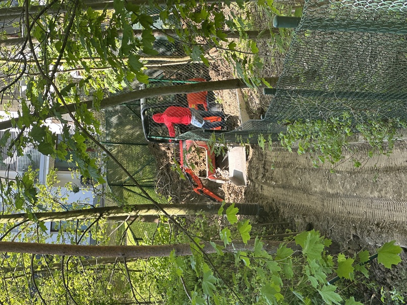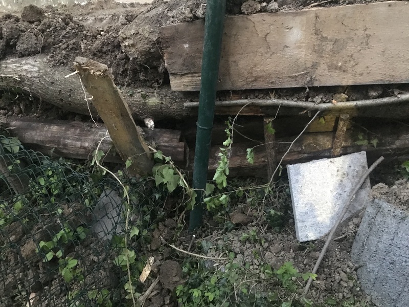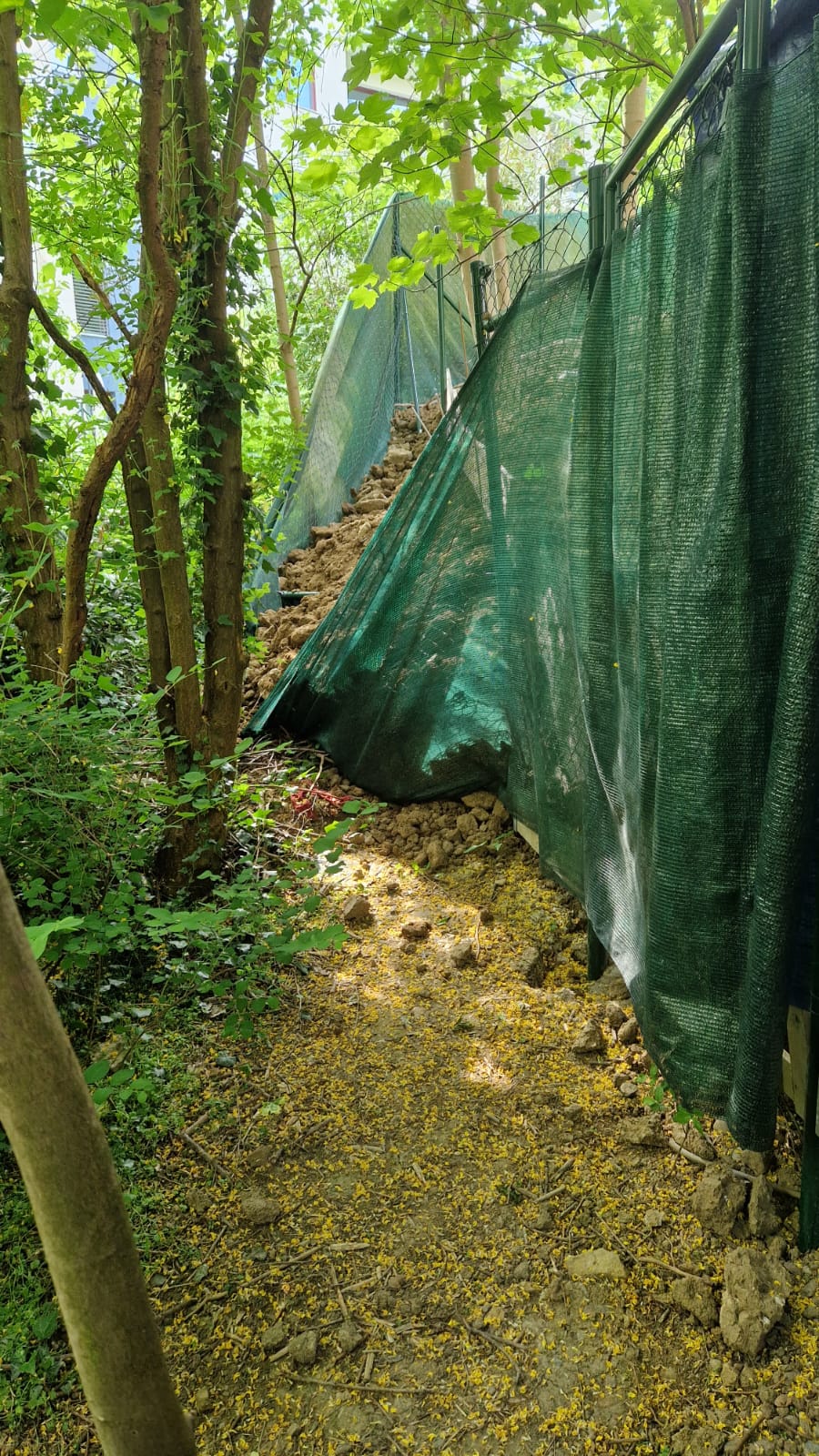 - 26.5.2023 Jelikož dělníci již nemůžou používat ilegálně zbudované přístupové cesty, vrší a opírají zeminu o plot. Ten nápor nevydržel a došlo k jeho provalení na pozemek sousedního domu.