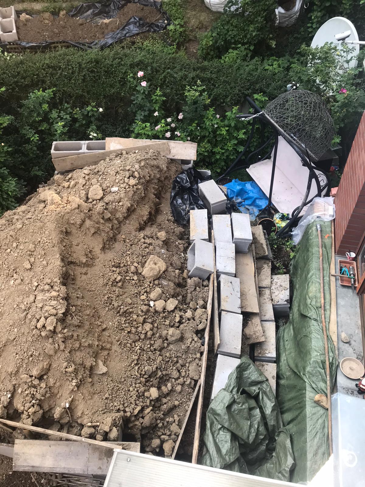 - 19.6.2023 Ukládání zeminy na zahradě stavitelky již ohrožuje fasádu bytového domu číslo 30 i stavitelku samotnou. Vlivem deště došlo ke zřícení betonové konstrukce určené pro ohraničení zeminy.