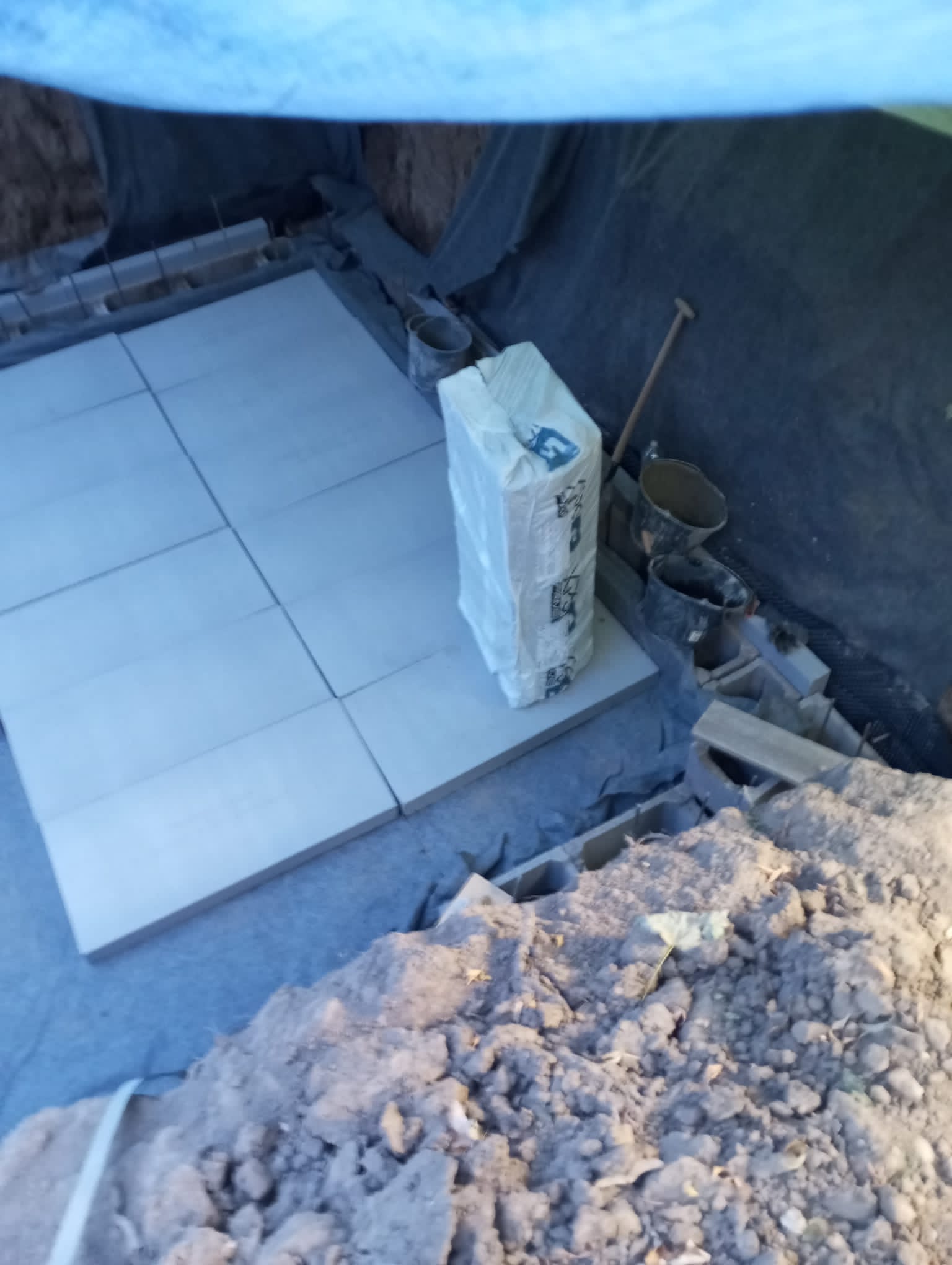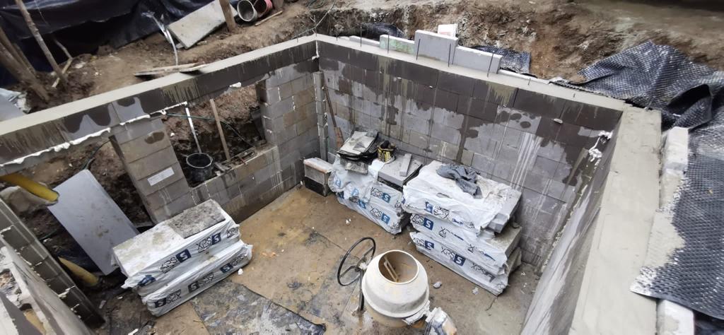 - 05.9.2023 Stavitelka v rozporu se stavebním povolením vybudovala obytný suterén. Ve stavebním povolení je výška 2,2m bez izolace a na obrázku níže je vidět výška 2,5m (obytná norma) a kompletní izolace okolo. Výšku lze snadno dopočítat z rozměrů betonových bloků.