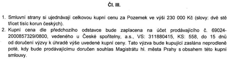 - Hlavní město Praha pozemek (82m2) převedlo pod Prahu 5 a ta ho prodala investorce za 230 tisíc Kč.