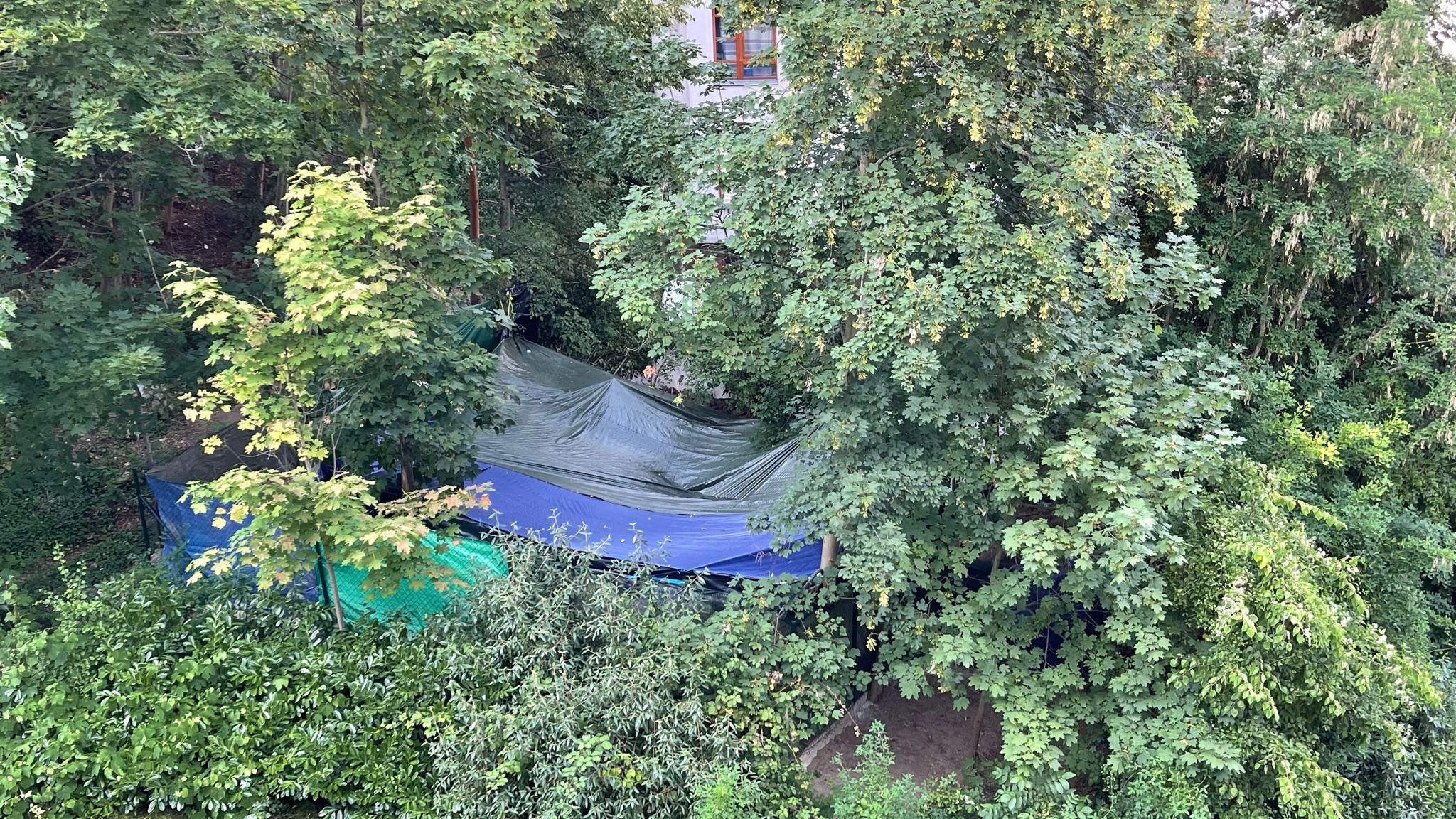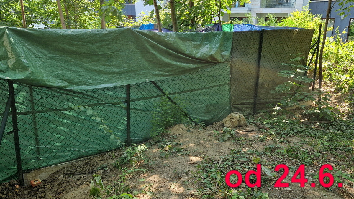 - 19.7.2023 Stavitelka se už ani nesnaží předstírat transparentnost a legálnost stavby. Staveniště kompletně zaplachtovala a dělá si v něm úplně co chce.