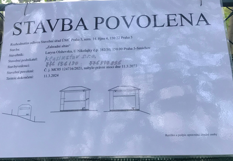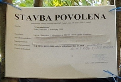 - 12.7.2023 Stavba je jeden velký podraz. Stavební úřad Prahy 5 tvrdí, že stavba byla zahájena 1.6.2023. To je asi o 1-2 měsíce později než je skutečný stav a o téměř 1 měsíc později než jsme si začali na stavbu stavebnímu úřadu stěžovat. Je to dokonce později, než o stavbě vydaly reportáž Seznam Zprávy. Tohle již považujeme ze strany stavebního úřadu za absurdní. Dále byl odstraněn štítek s povolením a stavební úřad to ignoruje. První verze štítku s firmou Klasikstav s.r.o. byla tedy falzifikát, jelikož byla vystavena před datem zahájení stavby.
