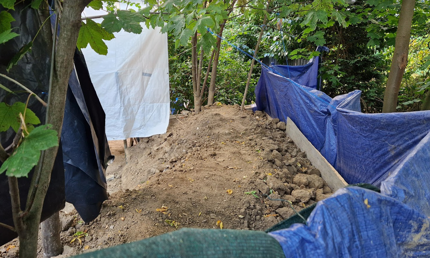 - 11.8.2023 Ukázalo se, co stavitelka skrývá pod plachtami. Přípravu k nelegální přípojce kanalizace přes sousední dům, nepovolenou tepelnou izolaci a 4 m hlubokou jámu, i když je povoleno podsklepení do 2.7 m. Vše míří k vykouzlení plnohodnotného obytného domu.