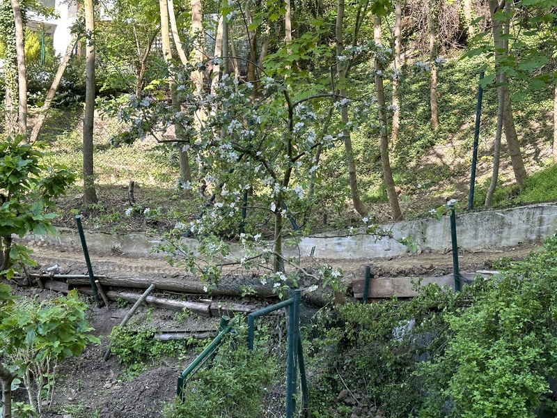 - Vytvoření nepovolené přístupové cesty přes pozemek SVJ. Náš plot prostě zrušen, keře Prahy 5 vykoseny, vzrostlý strom našeho SVJ pokácen. Připomeňme povinnost přistupovat ke stavbě pouze z bytu investorky (projekt B.8).
