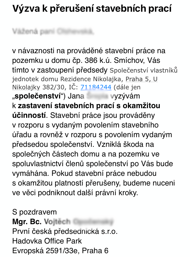 - 6.5.2023 předseda SVJ obou dotčených domů vyzval k zastavení prací. Naprosto bez úspěchu.