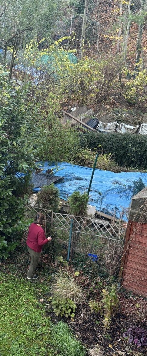 - 30.7.2023 Naše predikce opětovného provalení plotu se potvrdila. Nápor masy zeminy výšky asi 2m plot nevydržel a znovu se provalil. Reakce stavitelky byla bleskurychlá, plot posunula a zabrala pozemek, který ji nepatří. Samozřejmě se nikoho nezeptala, protože si ráda vezme vše, co jí stojí v cestě. Právo nehraje v jejím světě roli.